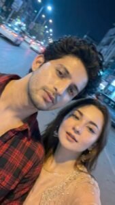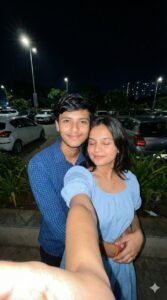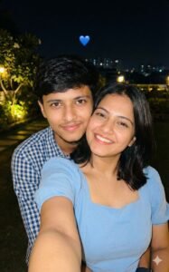 She is dressed in a light blue aesthetic Indian kurti, soft fabric, elegant and simple.The photo is a close-up taken outdoors at night, with a dark, softly blurred background, warm ambient lights and subtle greenery visible. The lighting is natural and soft, creating an intimate, affectionate, romantic mood. A small brie heart emoji floating above their heads enhances the romantic vibe Ultra-realistic, natural skin tones, candid selfie feel, shallow depth of field, cinematic nighttime lighting