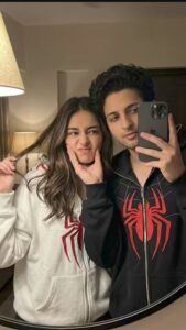 Using the provided photo generate a hyper realistic 4K A close up mirror photo the photo look natural, the selfie taking while using phone iPhone 14 Pro Max of a young couple in a dimly lit, cozy, indoor room . The man has same hair, is wearing Clothing: – Male Wearing an oversized black full-zip spider-themed hoodie.