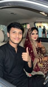 8K Hyper realistic candid wedding photograph captured on a smartphone camera inside a parked car after an Indian Muslim nikah ceremony. Groom seated in the driver seat wearing a plain black kurta, short styled hair, light stubble beard, relaxed confident smile, giving a thumbs-up gesture, natural skin texture, no makeup. Bride seated in the front passenger seat wearing a deep maroon heavily embroidered bridal lehenga with gold detailing, matching dupatta draped over head, traditional bridal jewelry including maang tikka, earrings, layered necklace, bold eye makeup with red lipstick, mehndi visible on hands, giving a thumbs-up gesture with a confident expression. Interior car lighting mixed with soft ambient outdoor wedding lights visible through the window, guests and venue faintly visible outside, realistic shadows, slight noise from phone camera, imperfect framing, close wide-angle perspective. No posing, no cinematic lighting, no artificial blur, no beauty filters, true fabric