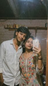 Create A iphone mirror selfie of woman in picture uploaded with a lo_fi background, with the men pictureuploaded, wearing a white aesthetic curve sleeves shirt ,and women wearing kurta with floral embroidery, learning on a woman shoulder his expressioncomposition -just anunintentional, candid short slightly blurry flash photography grainy texture edited soft both are eye contact with camera don’t change my face and don’t change my hairstyle add slightly smile on boy’s face