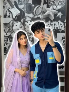 A stylish young boy taking a mirror selfie, wearing a navy blue loose shirt and white pants, holding the shirt casually with one hand, minimal jewelry, curly hair, realistic lighting, and soft white outline glow around him. The background is a modern grayscale aesthetic collage with elements like electric guitar, headphones, dice, cat face decor, 3D stars, and “STAR” graffiti text.portrait photo. Keep my face 100% same as in the reference image. Edit these photo to look like a beautiful couple.