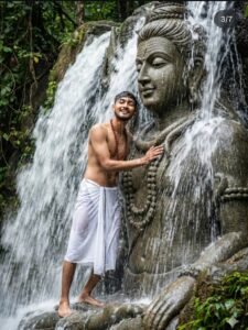 “A serene spiritual scene set in a lush rainforest. A large, intricately carved stone statue of Lord Shiva sits in a meditative posture beneath a cascading waterfall. Water flows continuously over the statue’s head, shoulders, and body, creating a mystical, sacred ambiance. The statue features detailed ornaments layered rudraksha malas, a coiled serpent on the shoulder, and the traditional jata hairstyle with a crescent moon shape.In the foreground, a young Indian man sits on a moss-covered rock directly in front of the statue. He is bare-chested and wearing a white dhoti wrapped neatly around his waist. His hands are held together in a prayer or (namaste), eyes closed, and his expression is peaceful and meditative, Water droplets compete skin as the mist from the waterfall surrounds him. The environment is vibrant and natural great terms, moss, and wet rocks frame the scene, with soft diffused light filtering through the forear canopy. The entire atmosphere feels spiritual, calm, and divine, with a blend of nature, meditatiori, and sacred energy.’