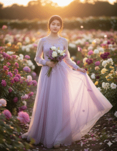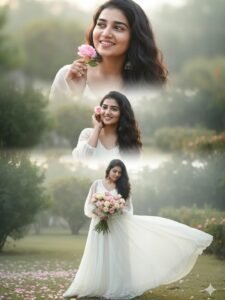 She has long, dark, wavy hair, glowing skin, and a soft, joyful expression. She appears in three beautifully blended poses within a dreamy collage composition: 1. Close-up: She smiles brightly, playfully holding a small pink rose near her face. 2. Medium shot: She gently places a pastel pink rose in her hair while smiling warmly. 3. Full-body shot: She looks slightly downward, holding bouquetol mixed pastel roses and baby’s breath, her expression calm and graceful. Her outfit is stylish and romantic a flowy ivory-white chiffon dress with delicate lace details and sheer sleeves, softly glowing in the natural light. The dress moves gently in the breeze, giving a cinematic, feminine touch. Background: A dreamy, soft-focus outdoor garden scene with blush pink petals, lush green foliage, and light morning mist. The atmosphere feels magical, fresh,