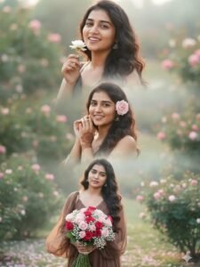 She has long, dark, wavy hair, glowing skin, and a soft, joyful expression. She appears in three beautifully blended poses within a dreamy collage composition: 1. Close-up: She smiles brightly, playfully holding a small White rose near her face. 2. Medium shot: She gently places a pastel pink rose in her hair while smiling warmly. 3. Full-body shot: She looks slightly downward, holding a bouquet of mixed pastel red roses and baby’s breath, her expression calm and graceful. Her outfit is stylish and romantic a flowy Brown dress with delicate lace details and sheer sleeves, softly glowing in the natural light. The dress moves gently in the breeze, giving a cinematic, feminine touch.Background: A dreamy, soft-focus outdoor garden scene with blush pink petals, lush green foliage, and light morning mist. The atmosphere feels magical, fresh, and elega