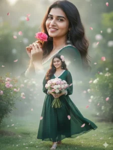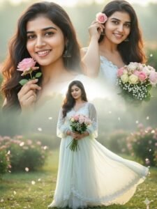 She has long, dark, wavy hair, glowing skin, and a soft, joyful expression. She appears in three beautifully blended poses within a dreamy collage composition: 1. Close-up: She smiles brightly, playfully holding a small pink rose near her face.2. Medium shot: She gently places a pastel pink rose in hor hair while smiling warmly. 3. Full-body shot: She looks slightly downward, holding a bouquet of mixed pastel roses and baby’s breath, her expression calm and graceful. Her outfit is 21 stylish and romantic a flowy Dark Green chiffon dress with delicate lace details and sheer sleeves, softly glowing in the natural light. The dress moves gently in the breeze,16 giving a cinematic, feminine touch.Background: A dreamy, soft-focus outdoor garden scene with blush pink petals, lush 22 green foliage, and light morning mist. The atmosphere feels magical, fresh, a