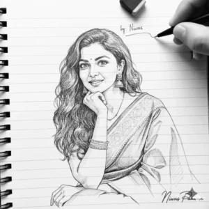 make a photo style drawing line pencil sketch and white about a face (details of the face exactly the same as in the uploaded image), intricate details, normal background note book page and right finger holding pencil and eraser, signature sketch connected with potlot written ” by: [Your Name] with art scratch.