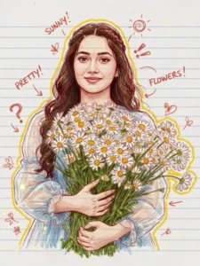 “Create an artistic hand-drawn illustration of a young woman standing and holding a large bouquet of white daisies with yellow centers. She has long, wavy dark brown hair and a soft, pleasant smile. The style should look like colored pencil sketch mixed with light watercolor shading. She is wearing a soft, translucent, pastel-blue dress with puffy sleeves that reflect gentle highlights.