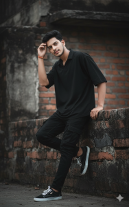 Create a photo of me posing against a dark, urban background with stone and brick elements, similar to the provided image. I should be leaning against a low stone wall or structure, looking towards the camera side with a confidence I should be wearing a black loose Shirt, black cargos, and black and white colour shoes. The lighting should be natural and slightly diffused, giving a moody yet clear feel. The overall style should be sophisticated and modern. left hand touching the