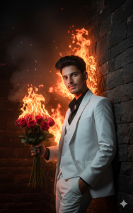 Ultra-realistic cinematic portrait of a stylish young man leaning casually against a dark wal, wearing a crisp elegant white suit. One hand in pocket, the other holding a burning bouguet of red roses, the flames touching the wall and setting it on fire. Smoke rises and spreads across the background, creating a dangerous and dramatic atmosphere. His hair is yoluminous, naturally tousled, expression calm and powerful, contrasting the chaos. Photorealistic skin, cinematic.
