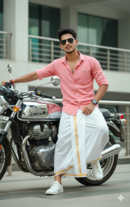 “Royal Enfield Swag a young man with attractive skin and short curly black hair, wearing a faded pink shirt with rolled sleeves, white dhoti with golden border, white sneakers, watch, chain, and sunglasses. He sits naturally on a Royal Enfield Continental GT 650 in a modern outdoor architectural setting, confident cinematic pose, holding the dhoti casually. Natural lighting, hyper-detailed, premium classy look, 9:16 aspect ratio, 1080×1920,
